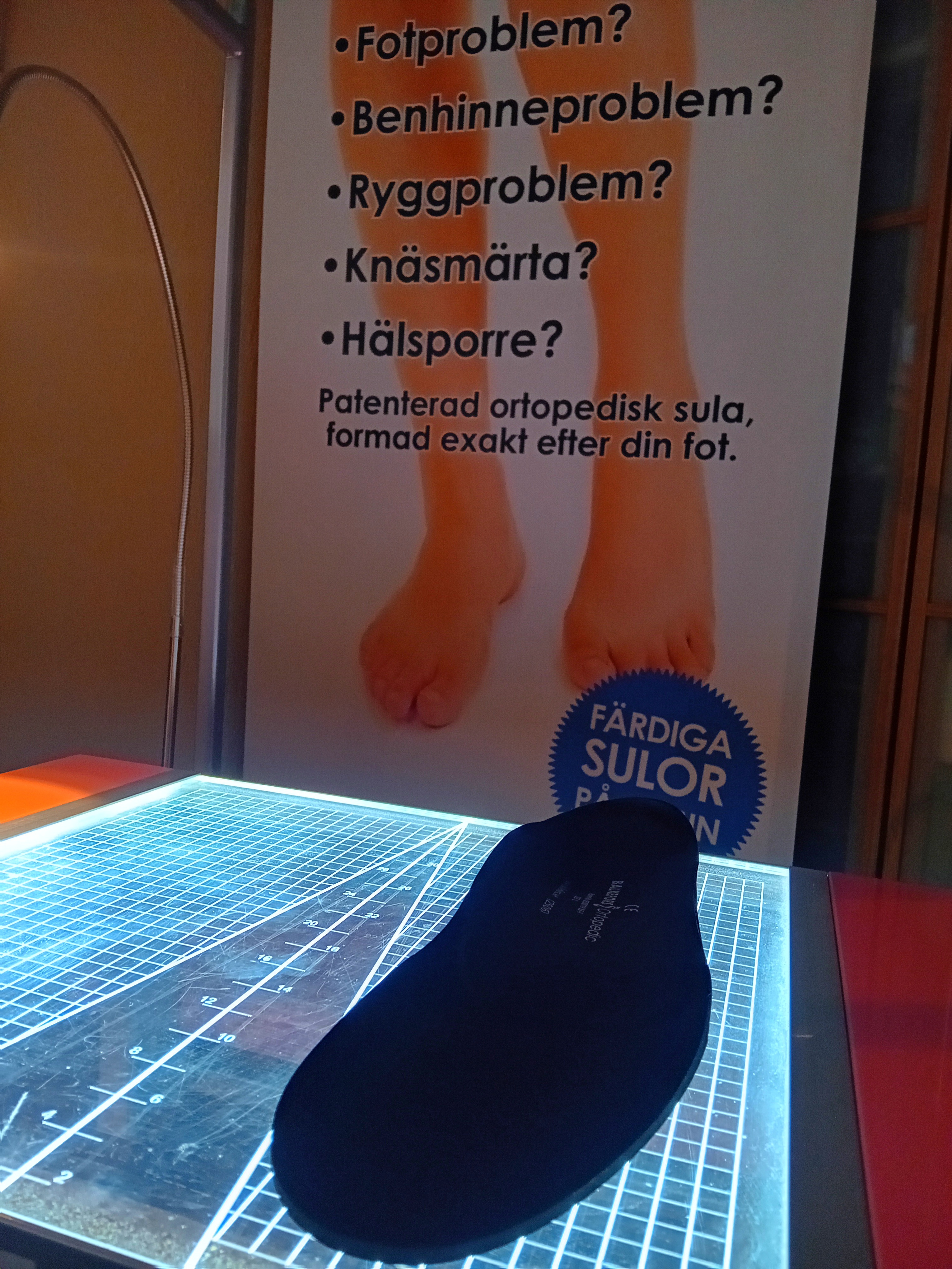 Vi erbjuder undersökning (vi filmar och analyserar ert gång- och/eller löpsteg) och att direkt därefter formgjuta ett inlägg från fötterna i ett belastat läge (90%) i en ortopedteknisk fotbädd. Vi slipar även inläggen för bästa passform. Ni erhåller även en del uppbyggande träningsövningar för snabbare muskeluppbyggnad och övrig återhämtning.